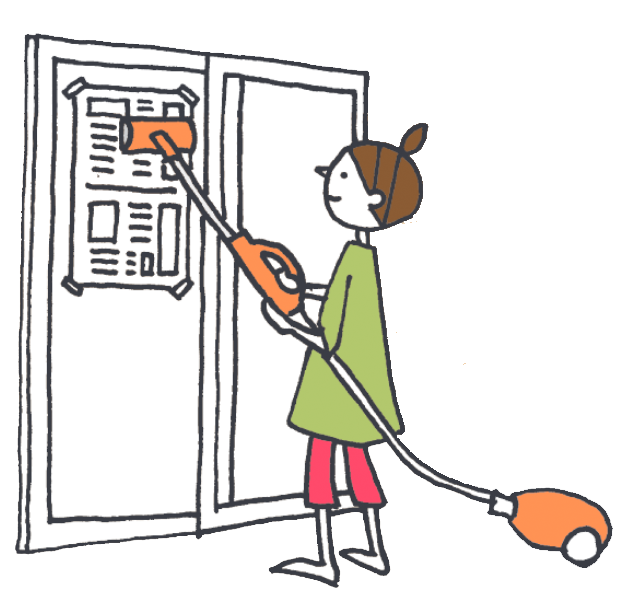 | 網戸の裏に新聞紙をあてて掃除機をかけるとホコリがよく取れ、網のたるみも防げる。内側、外側の順でかけよう。 | |