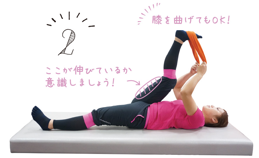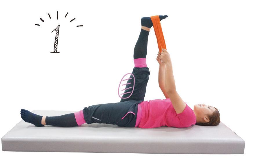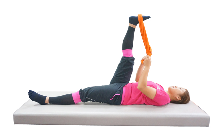 仰向けに寝てからタオルを足の裏にかけ 膝を伸ばした状態で足を頭の方に誘導する。