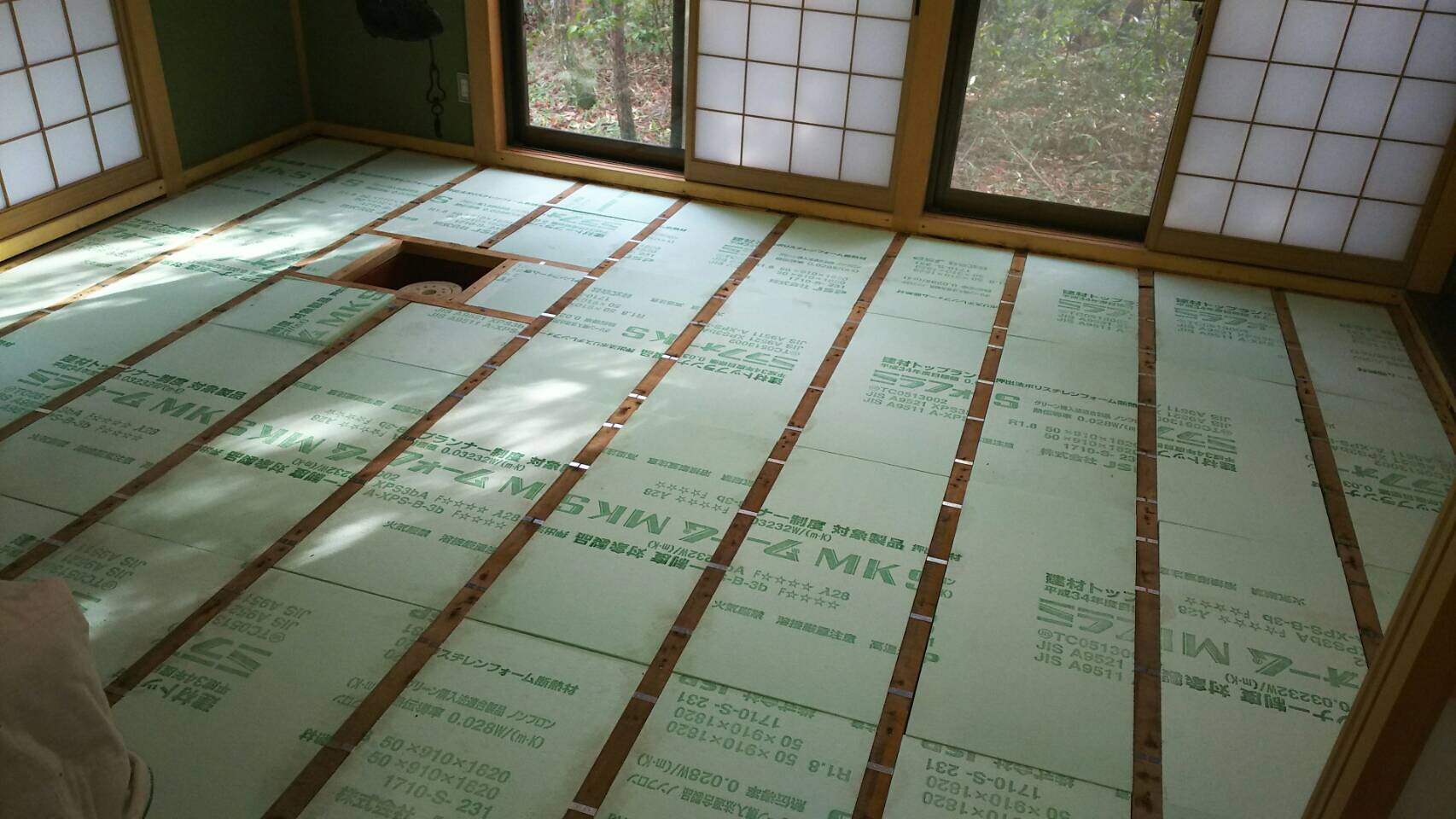 床をめくって断熱材をはめ込みます。地面からの底冷え防止に。