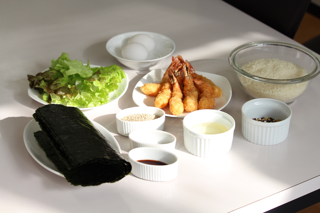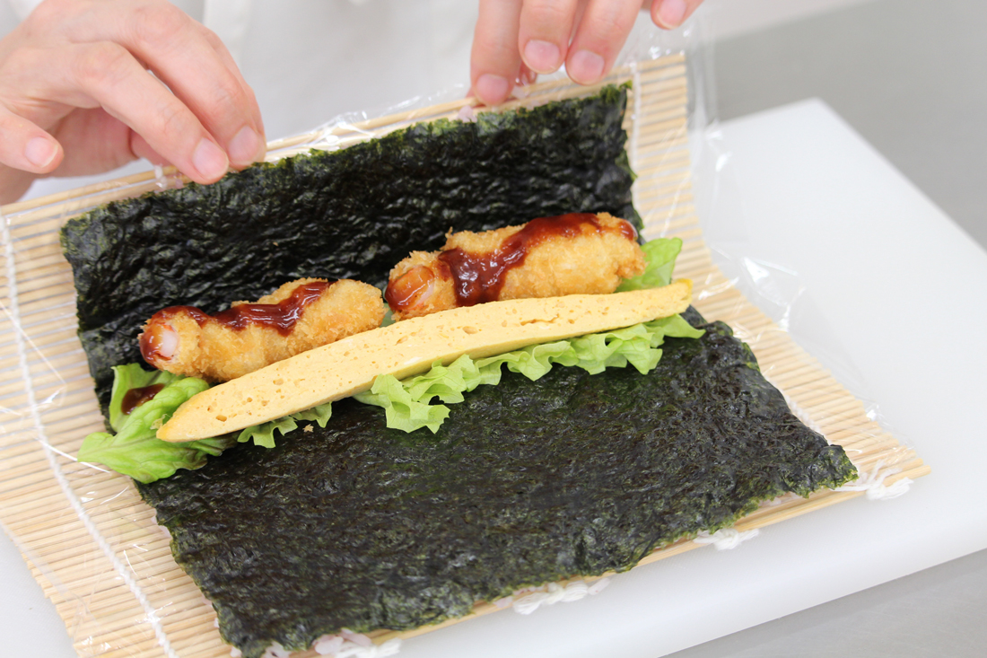 ごはんの上にラップをのせてひっくり返し、のりの上にグリーンリーフをのせ、マヨネーズをしぼってエビフライをのせ、手前からクルクル巻く。