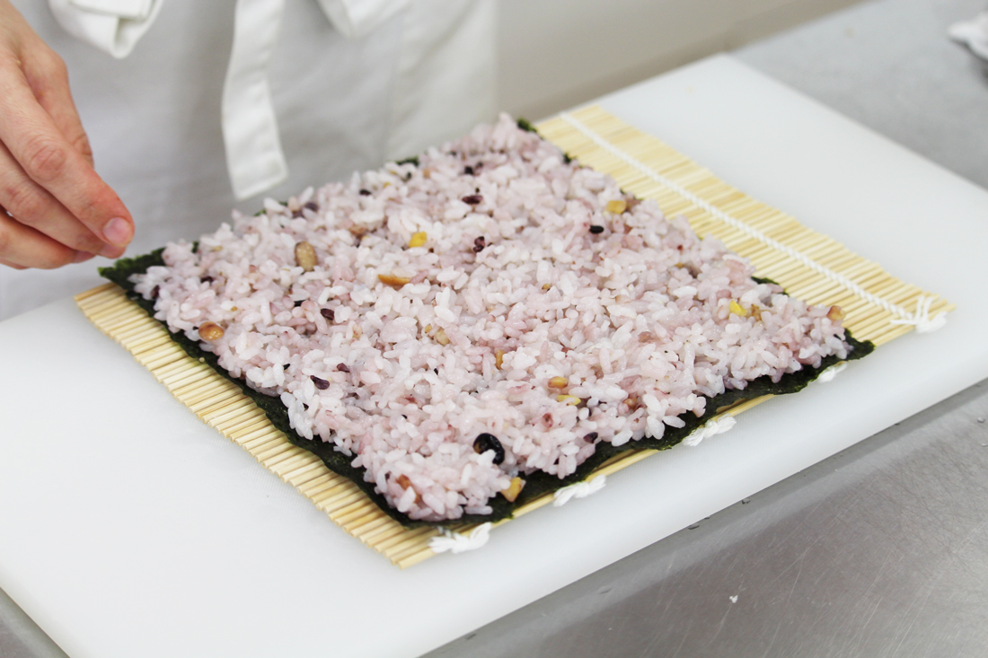 今回ご紹介するのは見た目鮮やかな十五穀米を使ったロール寿司です。〝まきす〟にラップをのせて、のり巻と同じ要領で巻いていきます。