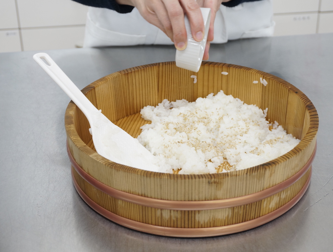 米が炊きあがったらすし桶にあけ、すし酢をかけて混ぜ合わせ、すし飯をつくる。