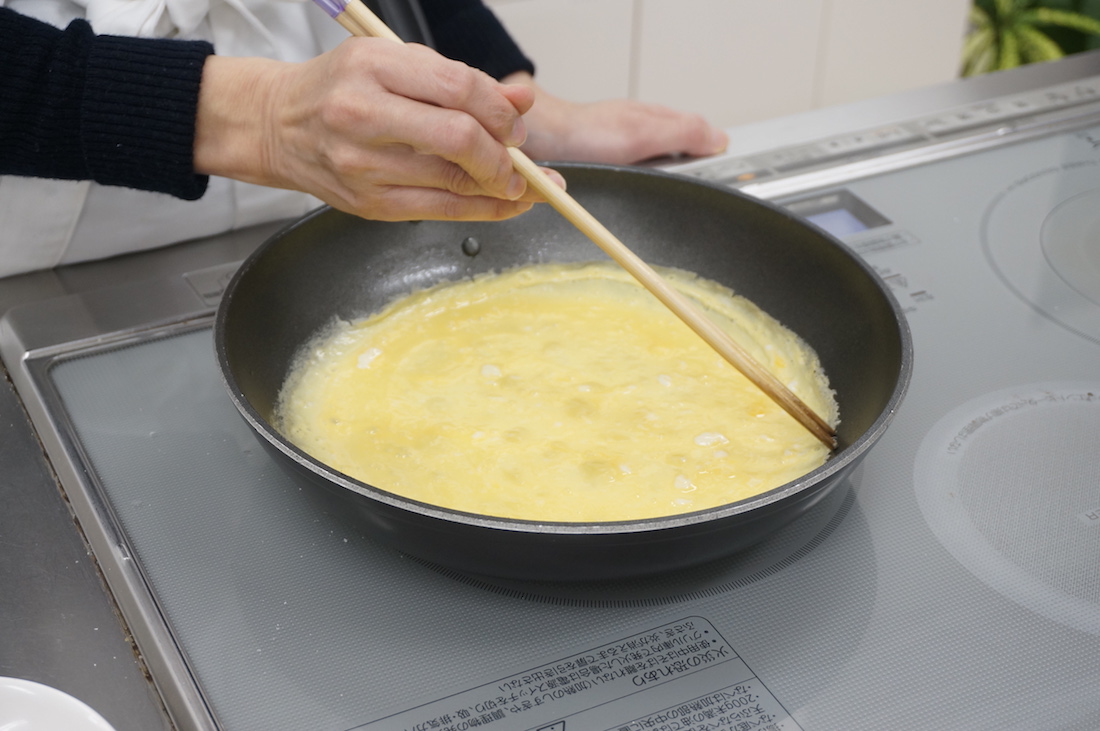 焼きあがったら、焼けた卵の下に菜箸を差しこんで持ちあげると破れにくい。