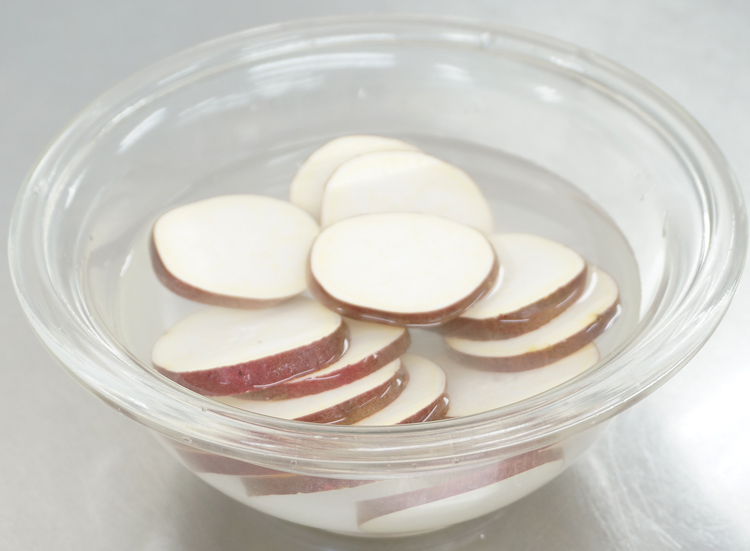 アク抜きのひと手間でさつまいもをおいしくいただこう! さつまいもは、料理に使う前にさっと水にさらすとアクが抜け、変色を防ぎます。また、さつまいもの表面についたでんぶんを流す役割も期待でき、揚げあがりがカラっと仕上がります。料理前のひと手間で、見た目がきれいに、食感よく仕上がります。