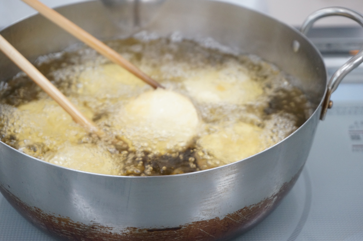 衣をつけ、160°Cに熱した油で6分ほど揚げる。