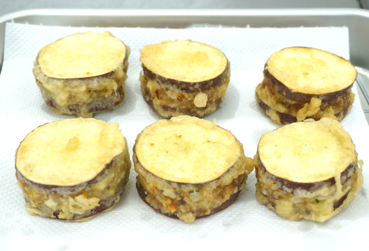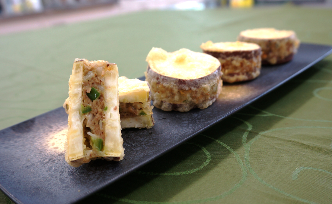 ホクホクした食感と優しい甘みのあるさつまいもは、秋の食材の代表格。さつまいものはさみ揚げは合挽き肉と野菜をサンドしたボリュームたっぷりの一品。皮の紫色と食用部分の黄色のコラボレーションも鮮やかで食欲をそそります。食欲の秋が訪れて、たくさん食べたいあなたにもぴったりのメニューです。