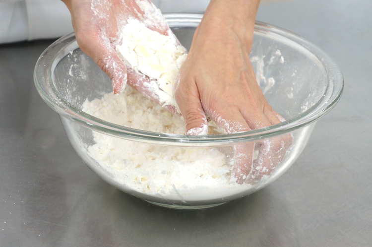 冷蔵庫で冷やしておいた1cm角のバターと薄力粉をボールに入れ、スケッパーで細かく刻んだあと手ですりつぶす。