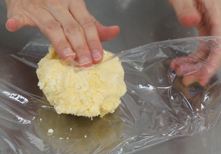 卵黄、水、塩を加えて混ぜ、あまり練らないようにしてひとまとまりにする。冷蔵庫で2時間から一晩休ませる。