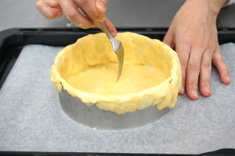 クッキングシートを敷いたセルクル型に生地をかぶせ密着させる。上の部分は外側に折り返し、フォークで穴をあける。