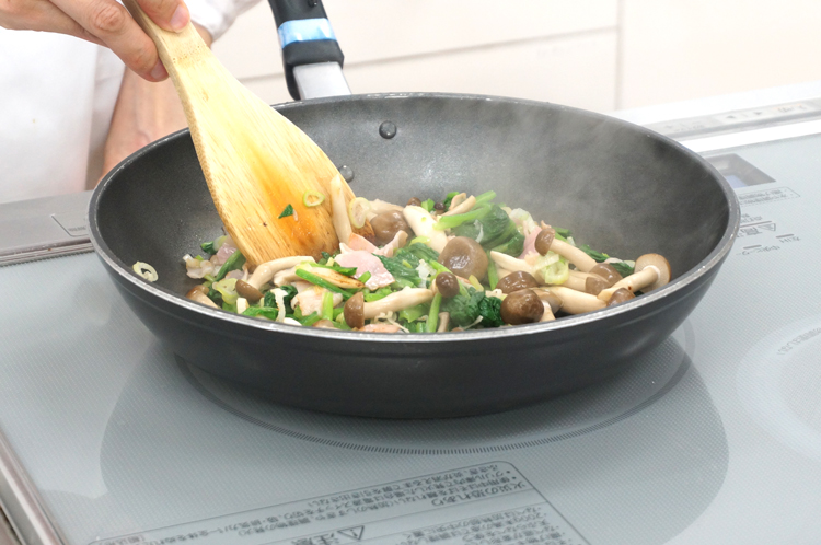 ねぎは小口切り、ベーコンは1cm幅、ほうれん草はゆでて3cmに切り、しめじはほぐしてサラダ油をなじませたフライパンで炒める。