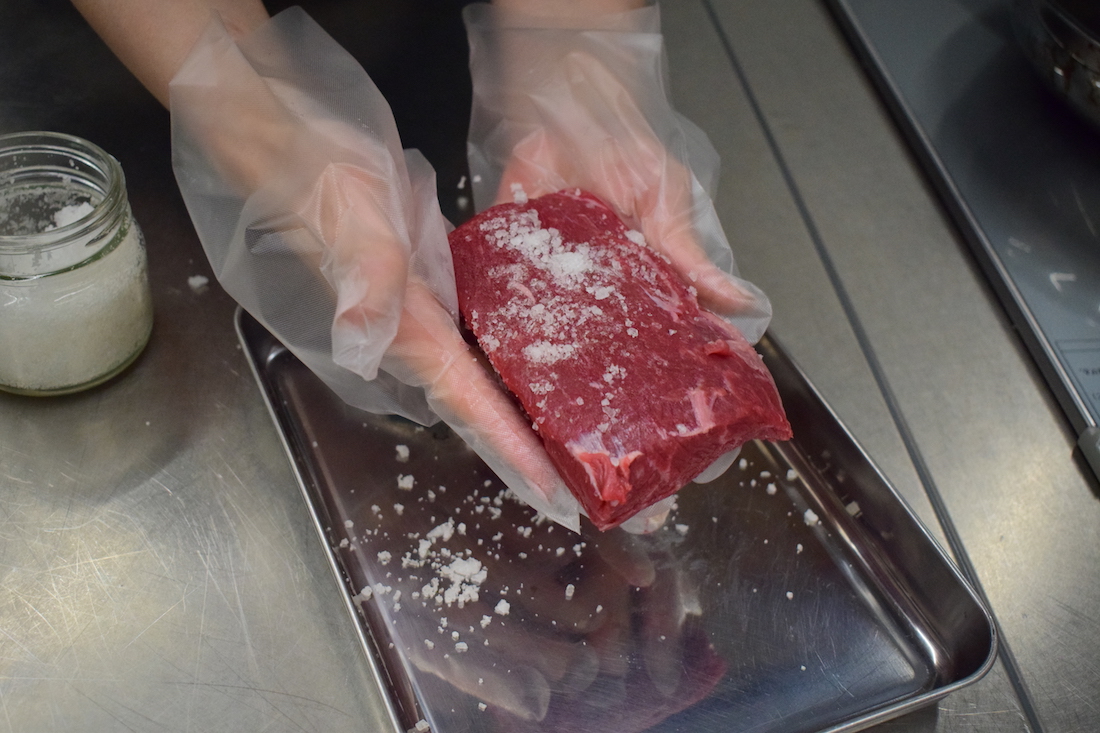 常温の状態の牛モモ肉に、塩・コショウをすり込んでおく。