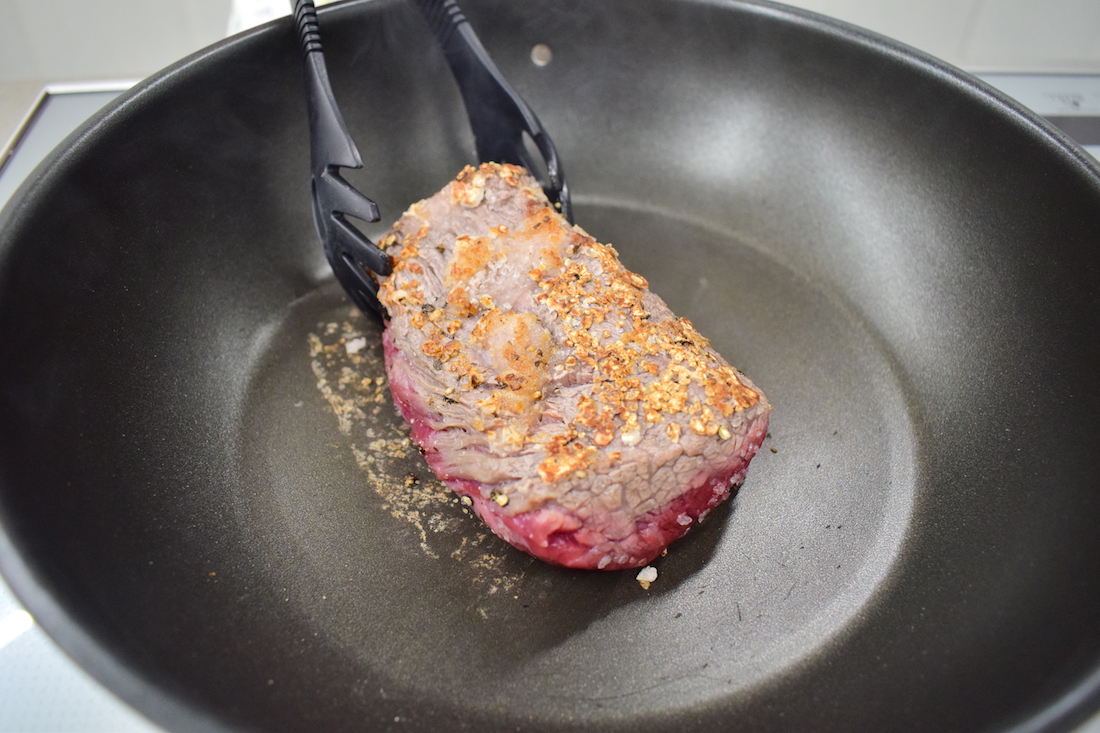 熱したフライパンで、牛肉の表面にまんべんなく焼き色をつける。