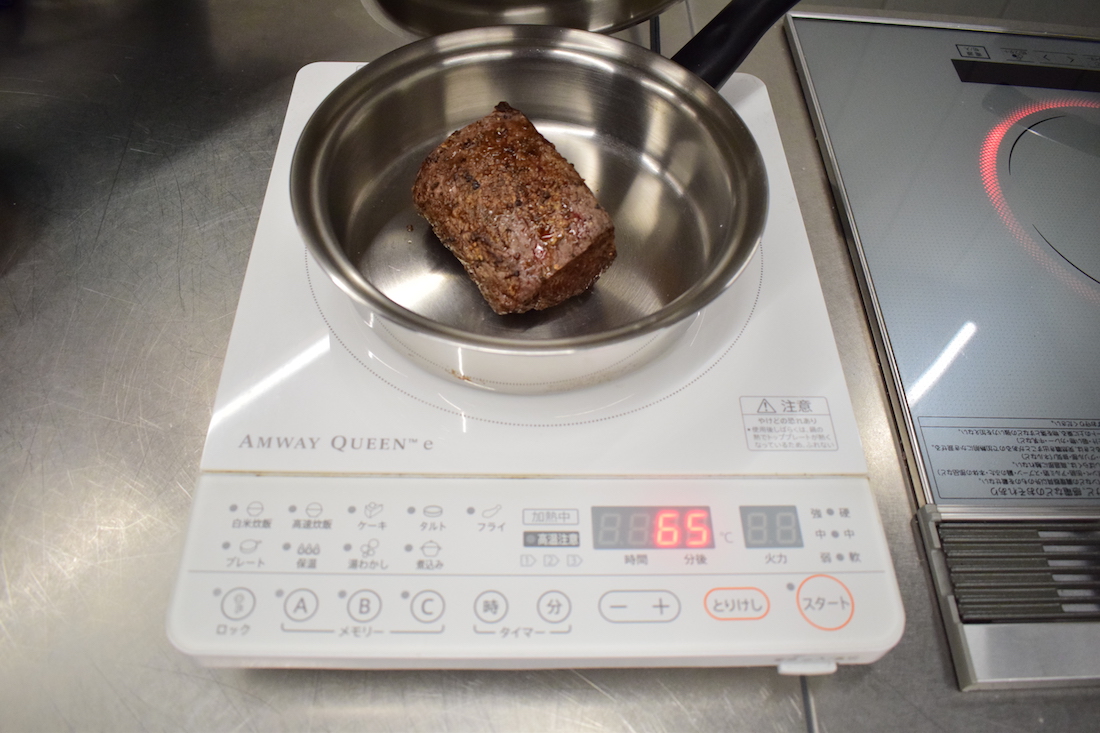 フライパンに蓋をして、保温65~70°Cで約1時間、肉に熱を加える。
