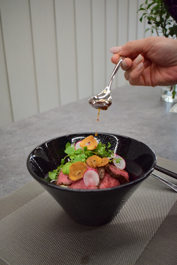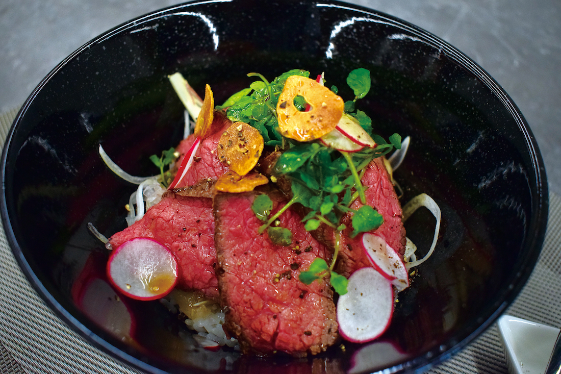 器にご飯をよそい、薄く切ったローストビーフと野菜を盛りつけて、ソースをかけていただく。