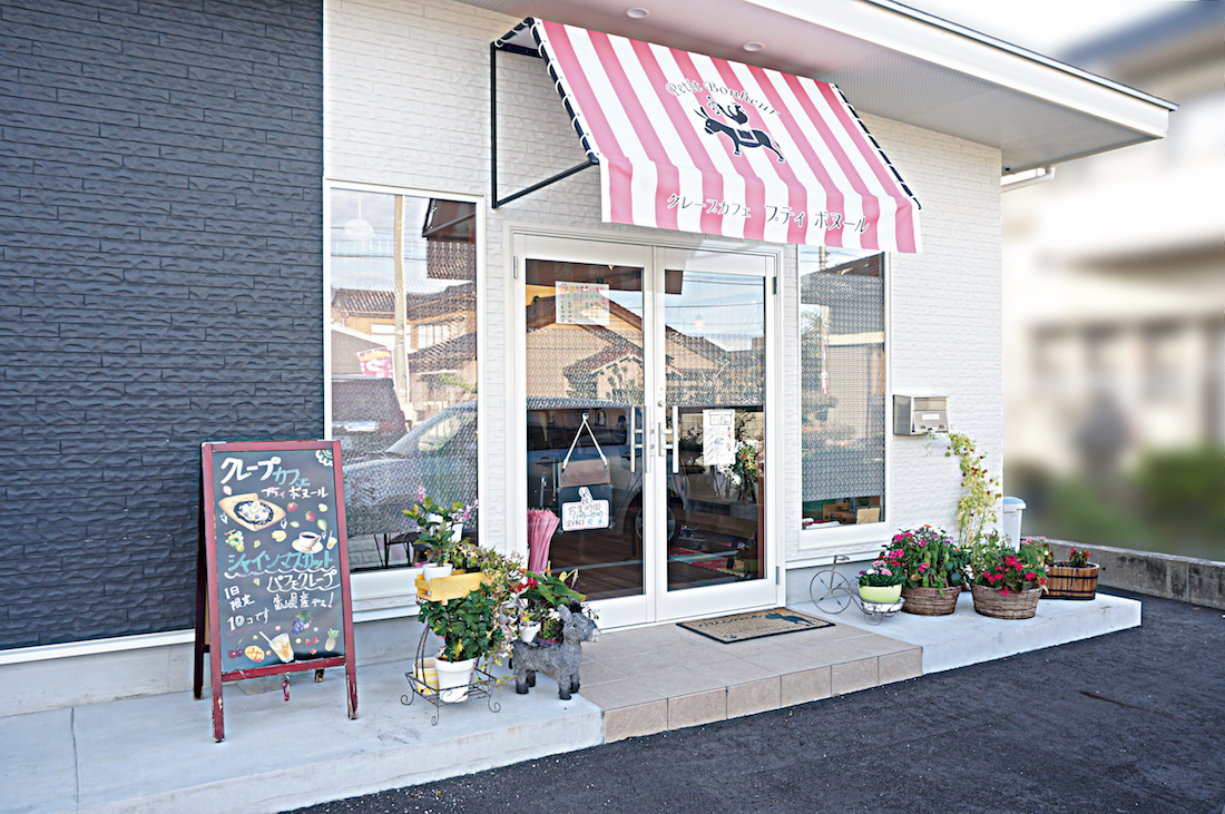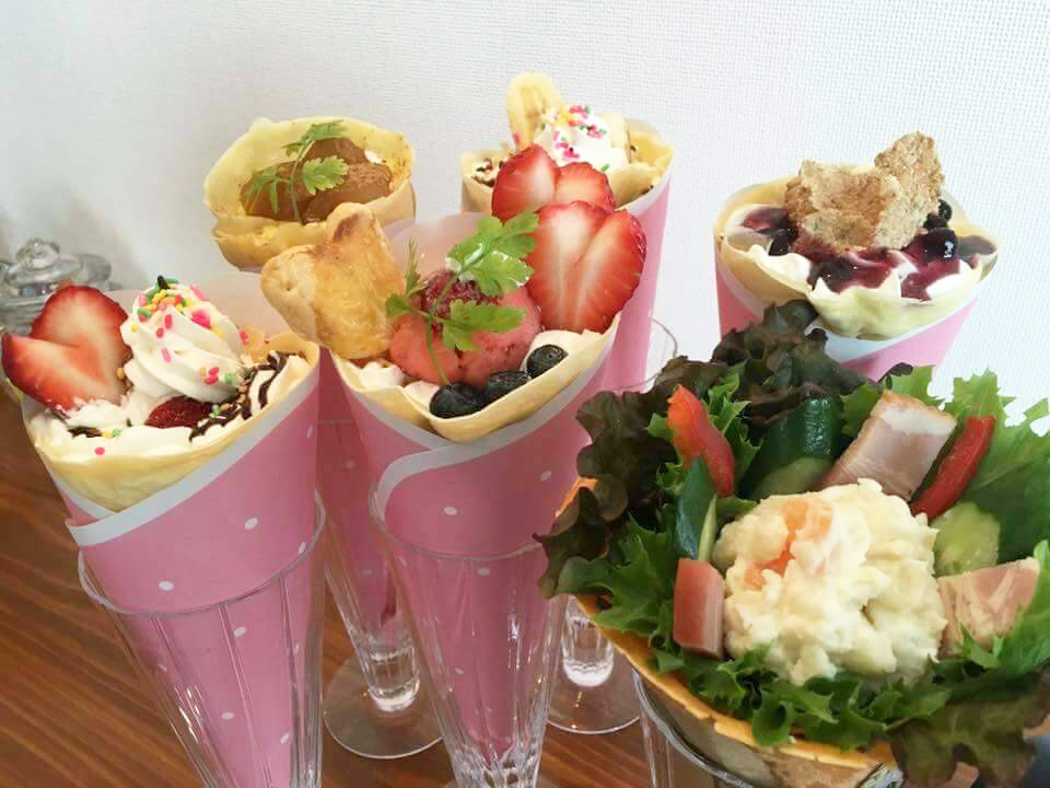 地元農園で仕入れた朝採りフルーツをゴロッと包み込んだ「パフェクレープ」が名物のクレープカフェ・プティボヌールさん。クレープにアレンジするジェラートは専門店にオーダー。自家製生地とクリームによく合うと好評です。また、フレッシュ野菜がたっぷりと包まれた「サラダクレープ」はランチにぴったりのボリューム感。どちらも店内にて堪能できます。