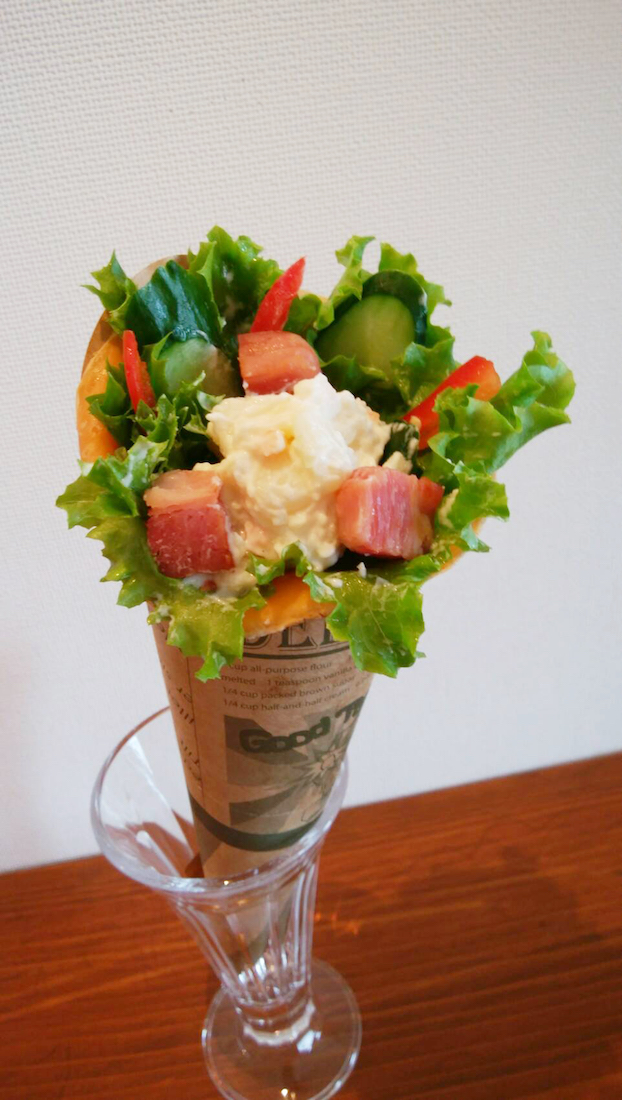 生地はプレーンと抹茶、パプリカの3種類。サンドイッチ感覚で食べられるサラダクレープは平日のランチタイム限定で500円とお得!(一部除く)