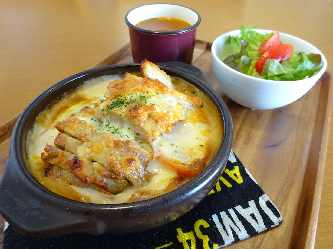 大きなチキンステーキがのった「チキンカレードリア(1,190円)」に本日のスープとミニサラダのセット。カレーソースとホワイトソースのまろやかな味わいに、爽やかなトマトソースがアクセント