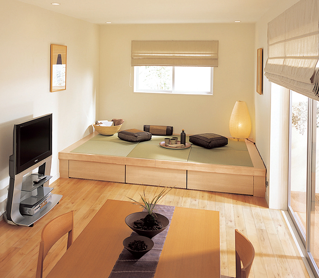リビングに畳の小上がりをつくって高さを活用した床下収納に