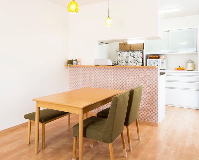 対面キッチンは家デコするには絶好のポイント。家具との調和を考えながら壁紙を選びましょう。