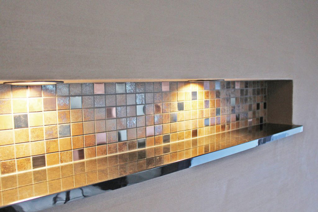 雑貨を飾るのに役立つニッチ棚は、タイルでさらに目を引くように。