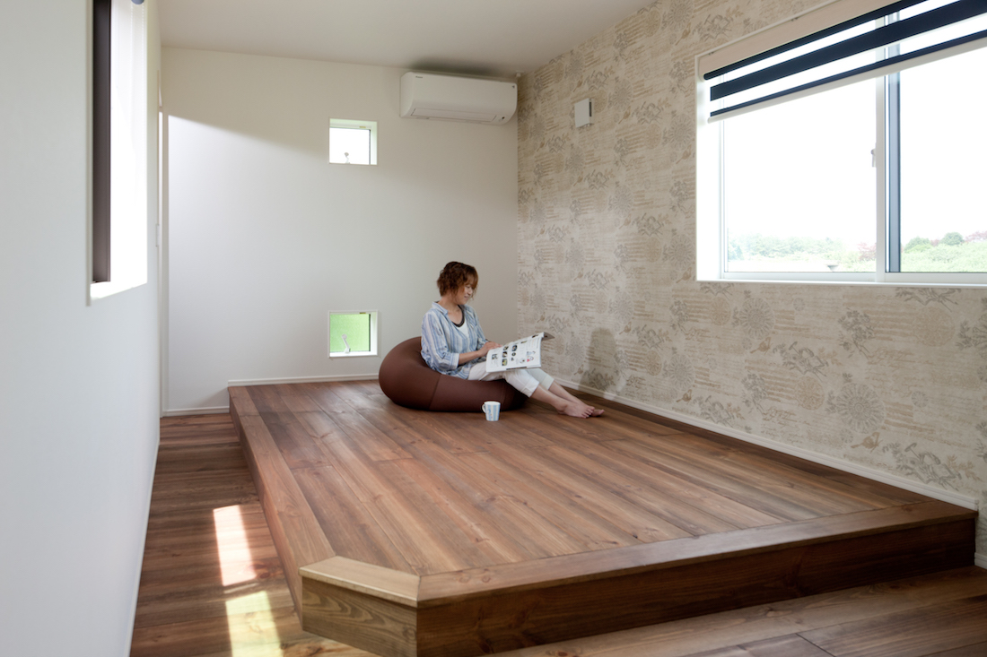 寝室は、布団で寝られるよう小上がりを設置。ちょっと腰かけてテレビを観ることもできます