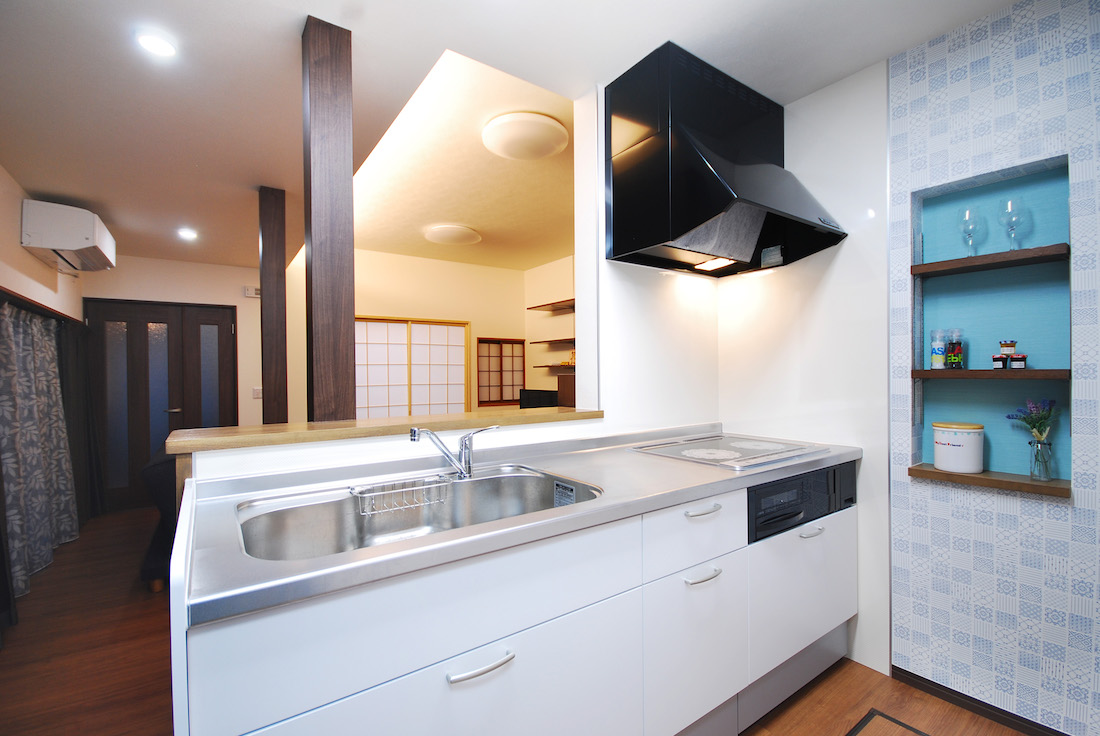 K様ご夫婦からの希望は対面式キッチンにすることでした。「しばしば訪れる娘夫婦や孫と会話が弾む空間を」とのこと。そこで北側の浴室とその横の廊下の約20センチ高くなっていたスペースをキッチンとし、広いリビングを見渡せるようにしました。奥様は、元気に動き回る2歳のお孫さんを見守りながら、炊事をすることができます。