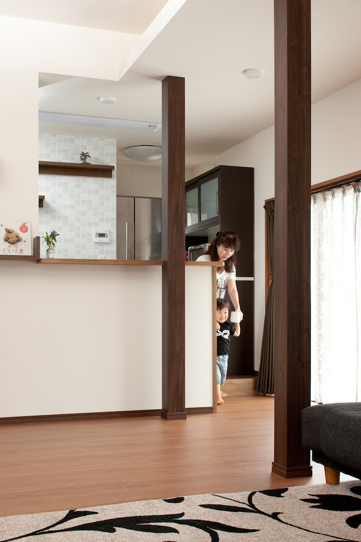 もともとあった段差を生かしたのでキッチンがリビングより一段高い位置に。中央の柱はデザインのアクセントとて活躍します