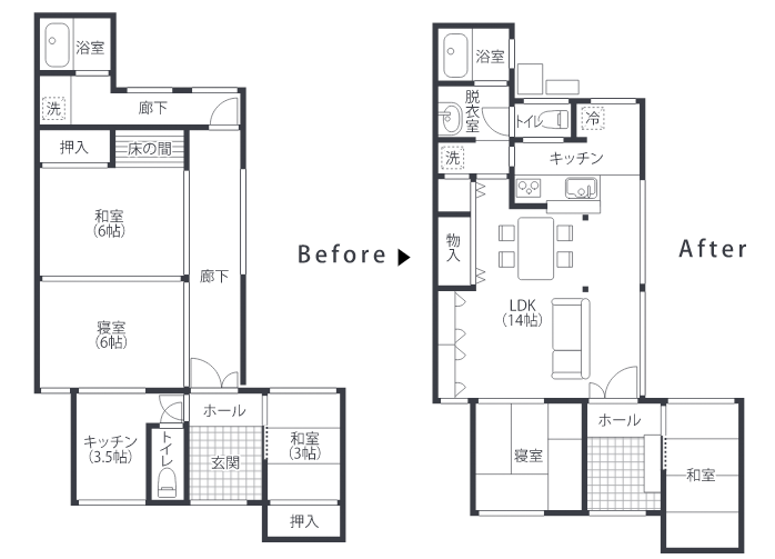 水まわりを一カ所にまとめ、和室2間と廊下をLDKにリフォーム。築50年の平屋家屋がコンパクトでモダンな空間に生まれ変わりました。