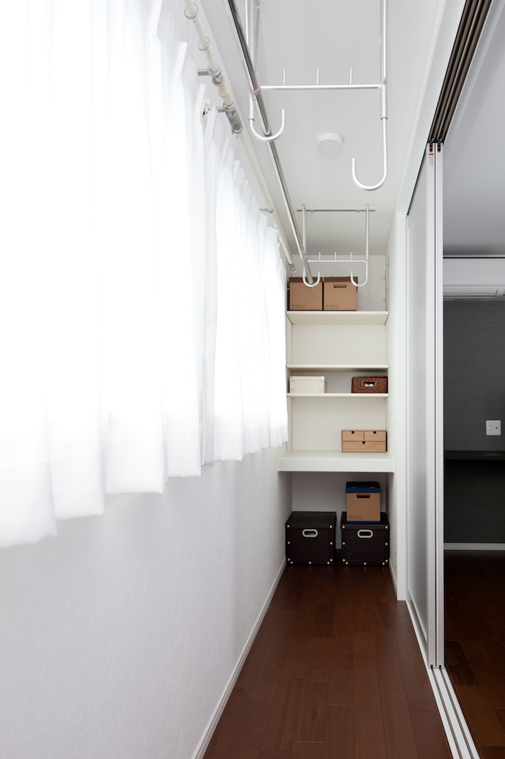 ご夫婦の寝室の隣に設けられたサンルーム。収納棚は奥行きのある造りにすることで、洗濯物の仮置きにも活躍します