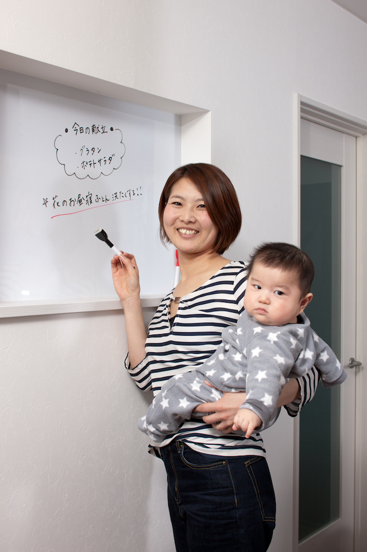 LDKの一角には、磁石がくっつくホワイトボードを設置して、家族の伝言板として活用。保育園の給食の献立を貼るのにも重宝しているそうです