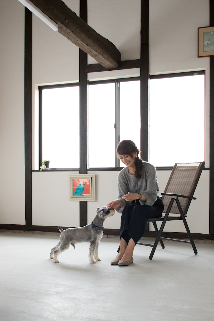 納屋の土間スペースを利用したドッグランは、木の温かい質感がある古民家風の趣き。天井や柱、梁などがそのまま生かされているため、深い味わいが感じられます。床のコンクリートの上にはモルタルを塗ることで、よりきれいに。また、2階部分をなくすことで開放感を創出しながらも、黒と茶とグレーでまとめることで落ち着きのある空間に仕上がっています。「走り回る姿を眺めています」とほほ笑むご主人。ほぼ毎日、コタロウくんと一緒にここで過ごしているそうです。
