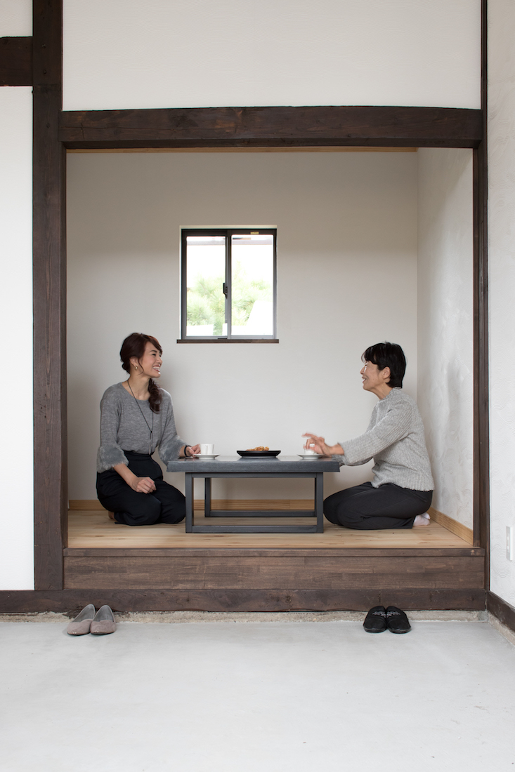 一方、奥様の趣味の部屋は、古い梁を利用したモダン和風の空間。パンやお菓子をつくるのが夢だった奥様のために、キッチンが据え付けられています。また、立地に合わせた快適な設計もポイント。風の通り道にあたる南東に大きな窓が取り付けられているため、「夏は涼しい風が入ってきて気持ちいいです」とほほ笑む奥様。床に使われた無垢材も足裏に心地良く、スリッパがいりません。