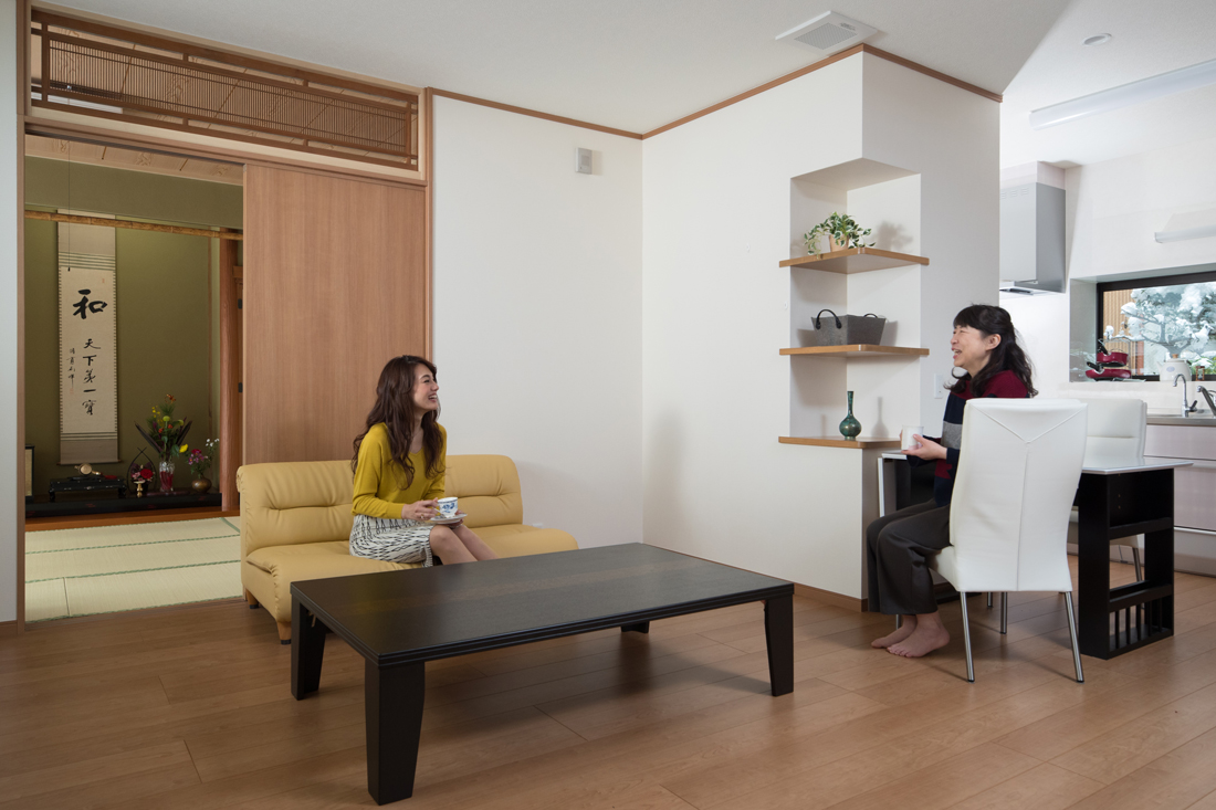 ご夫婦とお父様がゆったり寛ぐLDKは、区切られていた居間とキッチンをつなげ、もともとあった廊下をなくしたことで、一体感のある広々空間に。家族が集まりやすく、家事もしやすいつくりとなっています。なかでもキッチンは、作業台や食器棚などを奥様の希望通りに一新。「作業台が高くなり、調理スペースが広くなって快適です。IHに変えたので、魚もおいしく焼けて掃除も楽になりました」と奥様もニッコリ。また、この家族団らんの空間に光を取り入れるために、洗面室との間に設けられたおしゃれな明かりとりもI様邸のポイントです。