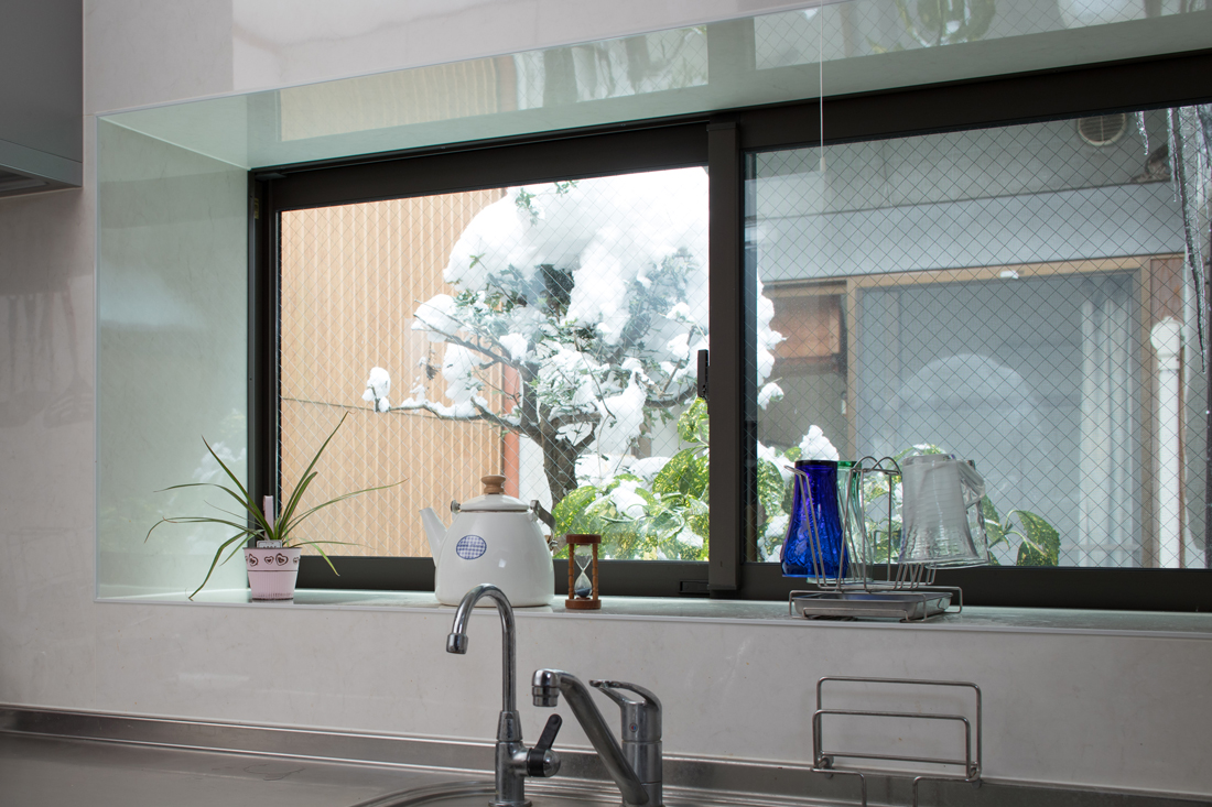 防火地域に立地する様邸。延焼ライン内のサッシは防火仕様にしなければいけないため、二重サッシは良質なものを採用しています。また、壁は断熱材を入れることで断熱性と防音性がアップ。雨と風の音だけでなく、住宅密集地のため以前は聞こえていたお隣の生活音も全く聞こえません。防音効果も高まり、より快適な暮らしが実現できました。