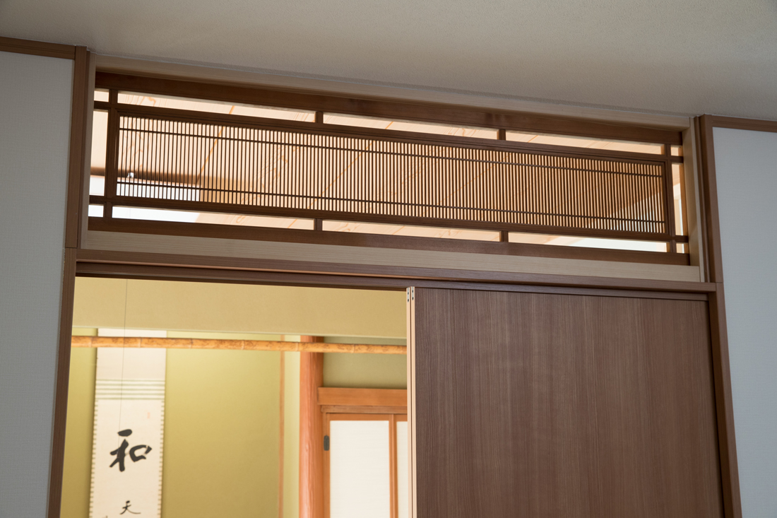 既存の欄間はシンプルなデザインのため、LDKの雰囲気にも見事に調和しています。その奥に見える竹の飾りや床の間もそのままの形で再利用しています