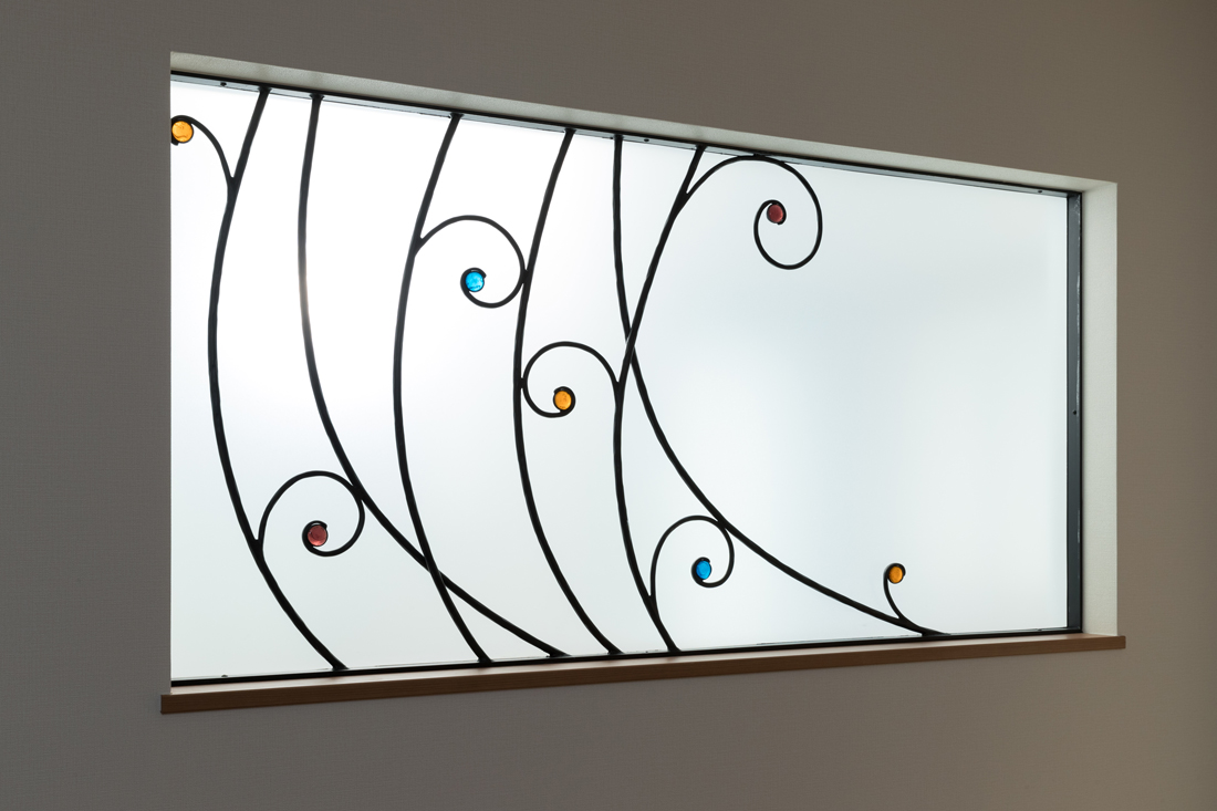 LDKの明かりとりは、スモークフィルムを貼り付けたガラスにアルミの格子を取り付け、既成の飾りをサイズに合わせてアレンジしたセミオーダー品