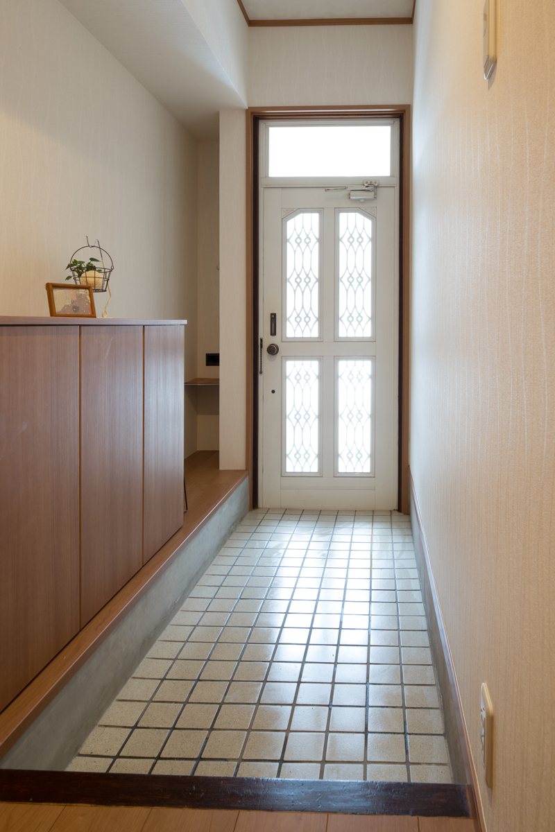 玄関の左側に見られる段差は、リフォームによって空間を広げた部分。内側にポストの入り口を取り付け、玄関収納を設置しています