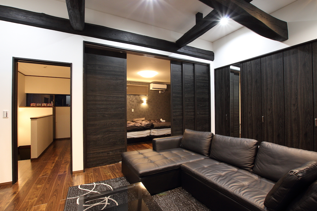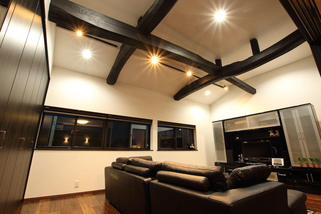 モノトーンをコンセプトにインテリアや家具をコーディネートしたM様。立派な梁が部屋のシンボルとなり和風とモダンがミックスした洗練された空間に。梁を見せたことで天井も高くて開放的