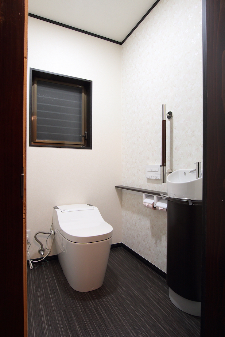 親世帯のトイレはお掃除しやすく落ち着いた空間をイメージ。施工前にあった段差も解消し、バリアフリーにも配慮してあります。手摺や建具はブラウン系で統一し、シックな雰囲気に