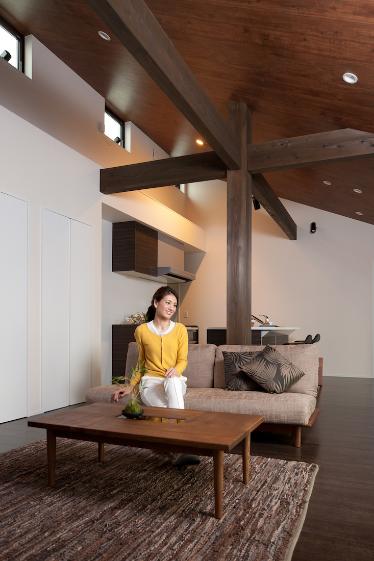 全面吹き抜けになった開放的な大空間の中でひときわ存在感を放つ大黒柱は、太い梁と相まって、懐かしさと安心感を創出します。吹き抜けのトップに窓を設け、緩やかな勾配天井にすることで、空間に広がりを演出するとともに、風の通り道をつくっています。トップの窓はリモコンで開閉可能。また、LDKからフラットで続く広い縁側も、自然と親しめる空間。近所の方との会話を楽しめる場でもあります。