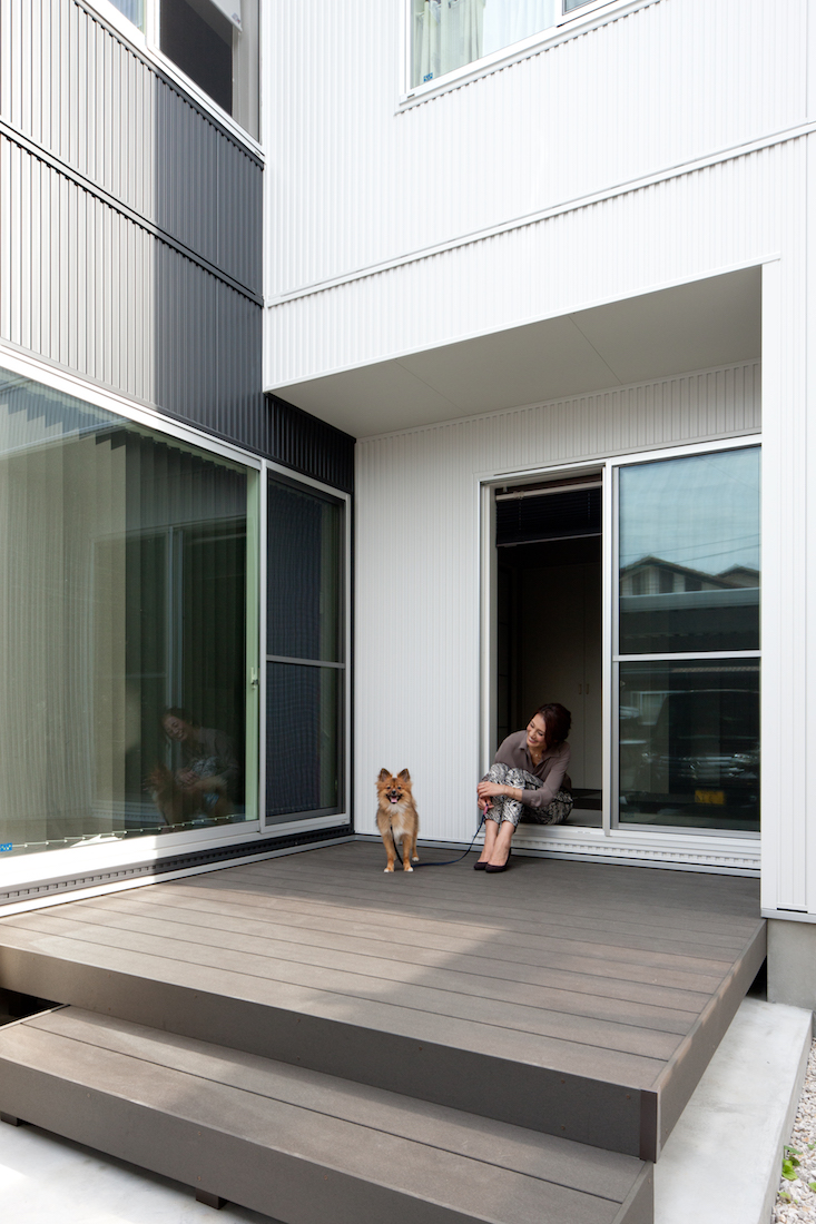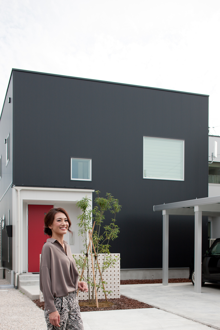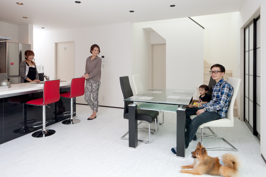 白と黒の外壁に赤のドアが映える外観。内装も、〝白と黒でまとめた生活感のない空間〟をテーマとした、ホテルのようにスタイリッシュな雰囲気。そのような中にも、常に家族の温もりを感じられるLDKやウッドデッキ、みんなが足を伸ばして入浴できる浴室など、ご主人の「みんなで楽しく暮らしていきたい」という想いがこめられています。また、水に強く滑りにくい床材や、調湿・消臭効果を持つ内装壁材エコカラットなど、愛犬への思いやりも。「この家をずっと大切に扱っていきたいです」と微笑むご夫婦の表情が成功の証です。