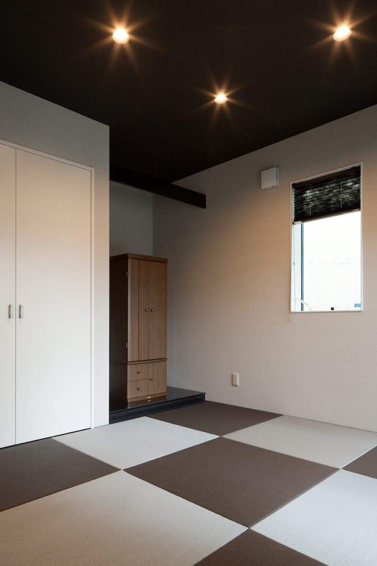 天井に黒を用い、畳を黒とグレーの2色使いにすることで、他にはないモダンな雰囲気を演出