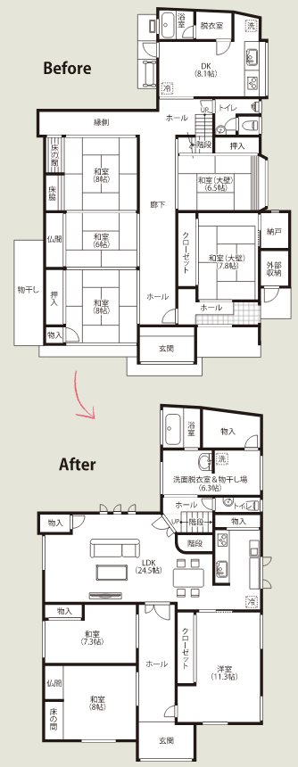 旧宅は、十分な部屋数と広々とした廊下のある住まいでした。そこで、現代の暮らしにとってムダなスペースを必要なスペースにまわすことで、暮らしやすい間取りにリフォーム。