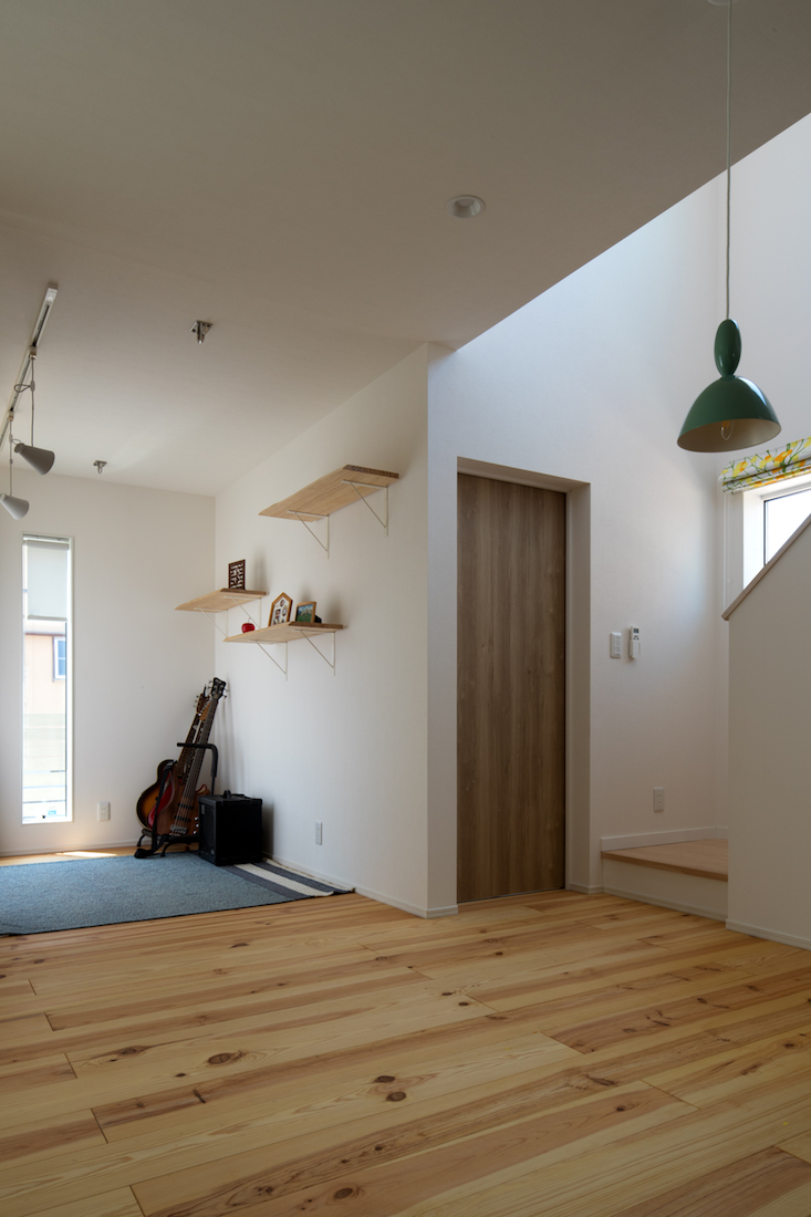 無垢のフレンチパインがフラットフロアで続くリースペースも、自然素材の温もりに満ちた空間。ご主人がギターやベースを楽しむ場所でもあります。写真右側の建具の向こうには、家事室が広がっています