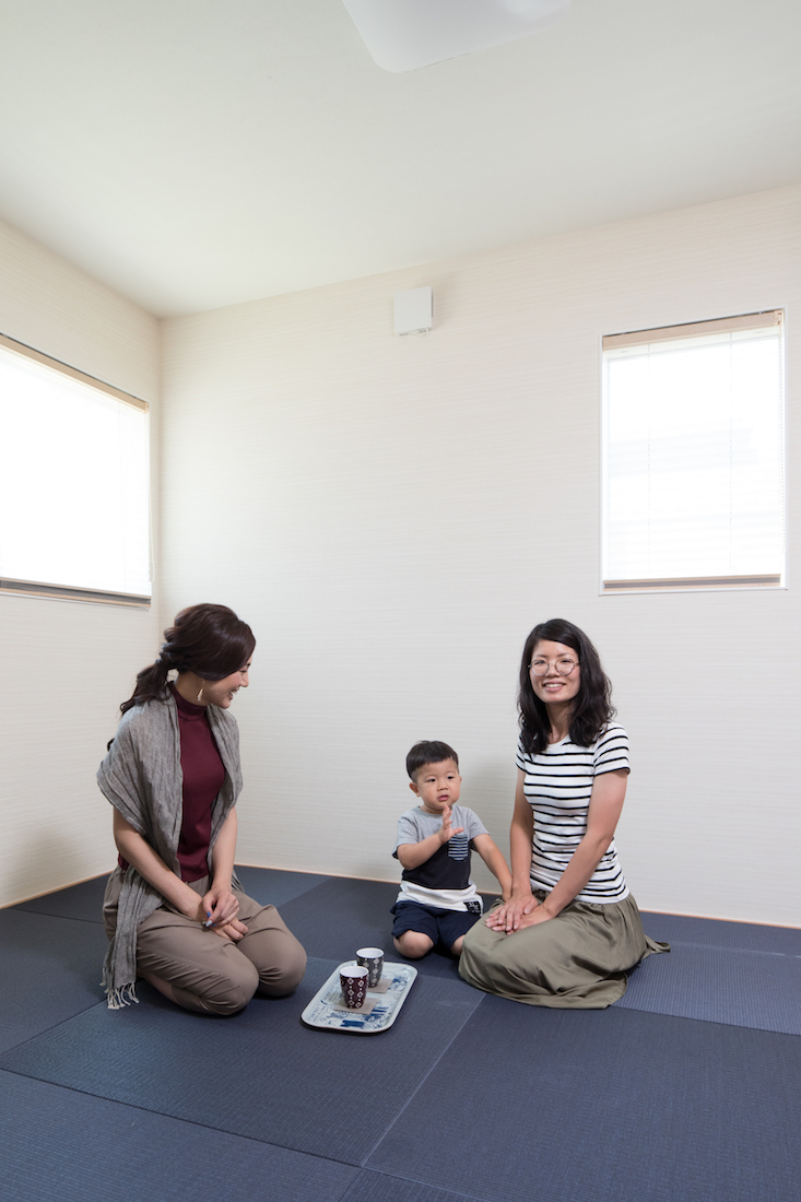 その窓からは芝生が見え、開放的で大きな掃き出し窓を開ければウッドデッキに出られます。「これからは、友人を招いてバーベキューを楽しみたいですね」と微笑むご主人。その際も、ご友人のお子様を芝生で遊ばせながら、楽しい時間を過ごせます。また、ご友人を泊めるために設けた2階の和室は、ご両親との同居を見据えた空間でもあります。