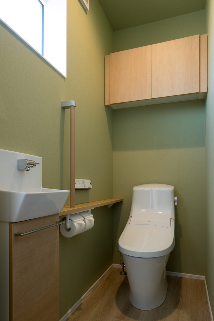 1階はグリーン、2階はイエローと、ご夫婦が壁紙にこだわったトイレは、お手入れのしやすいシンプルなフォルムが特徴です。節水機能とお掃除リフトアップ機能は標準仕様で、手洗いカウンターはオプション