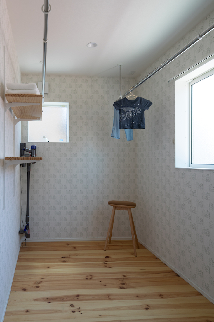 お子様が小さいことから、洗濯物が多いご夫婦。この家事室では、たくさんの洗濯物を一度に干せるだけでなく、乾いた洋服やタオルなどを畳んだまま保管できるよう、棚を造作し取り付けました