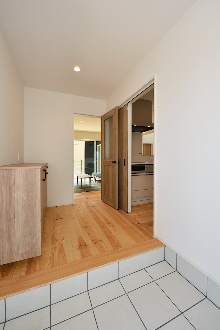 玄関からの眺め。床に使われた無垢のルンチパインがフラットで続くバリアフリー設計のため、お子様やお年寄りにも安心です。T様は靴が多いことから、標準仕様の収納とは別にシューズボックス(左側)を設置しました