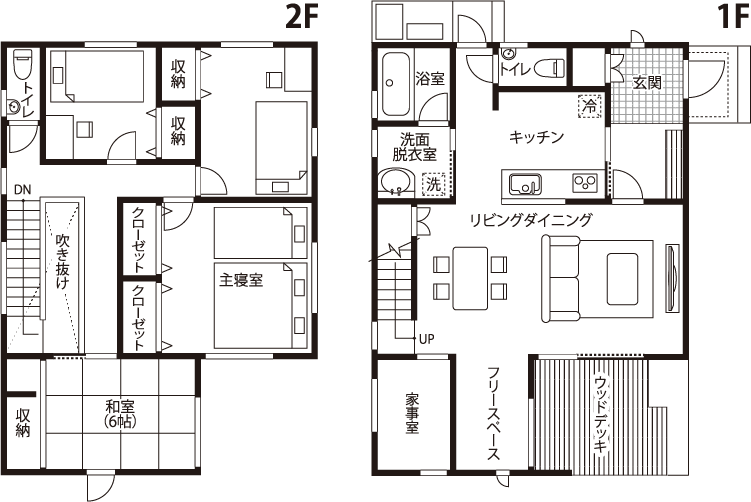 T様邸は、ZERO-CUBEに家事室・フリースペース、ウッドデッキ、和室をBOXとしてプラスした間取り。