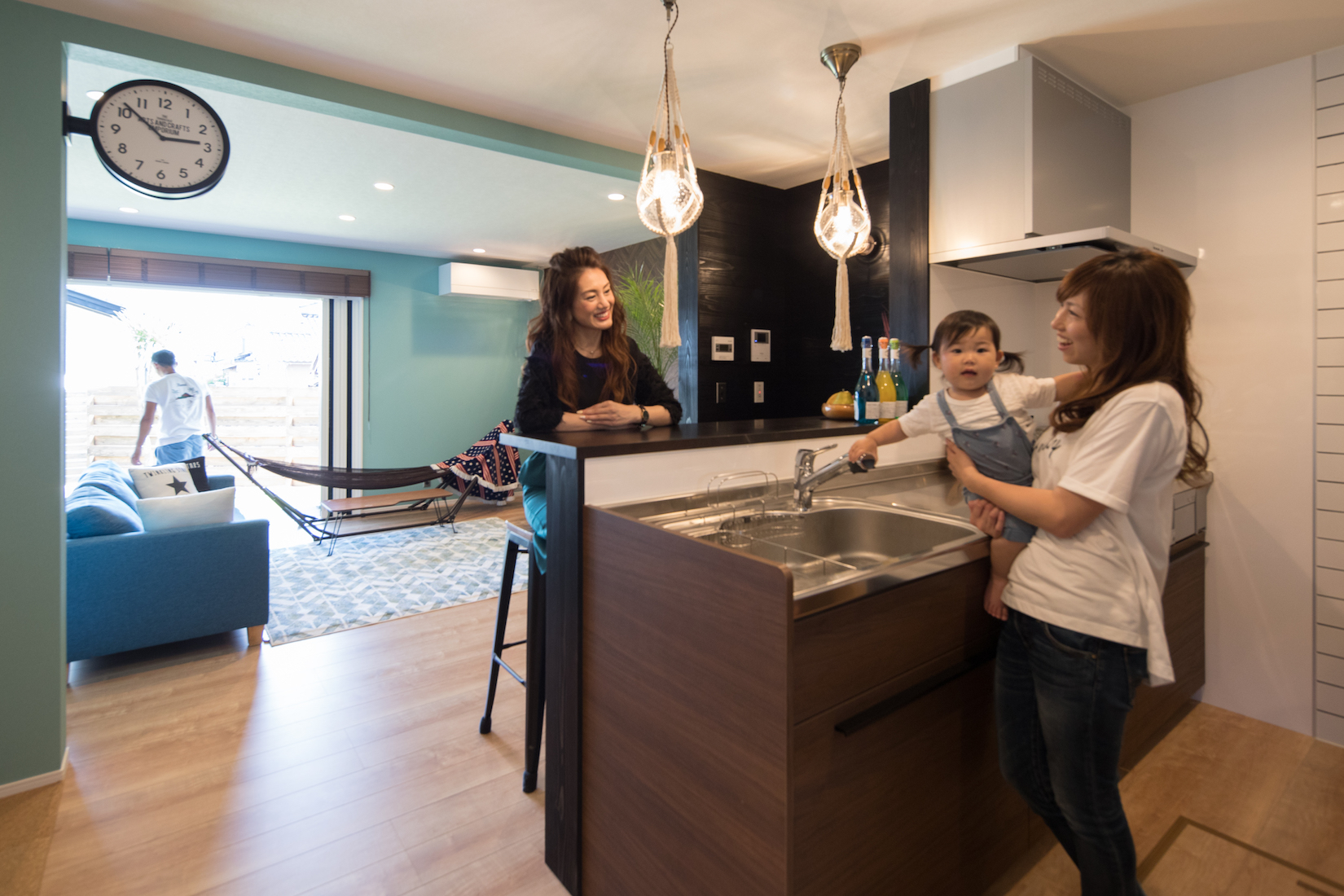 LDKに入ると、開放感あふれるカリビアンブルーの壁紙と、大きな窓に目を奪われます。折れ戸になっている幅3.6mもの全開口サッシを開くと、ウッドデッキを通じて庭とリビングが一体化し、広々としたアウトドア・リビングが出現。「友達を呼んでバーベキューをしたり、夜空の下で音楽をかけて過ごしたり、庭にテントを張ってキャンプも何回もしました。東京暮らしの友人にすごく羨ましがられましたよ」とご主人。